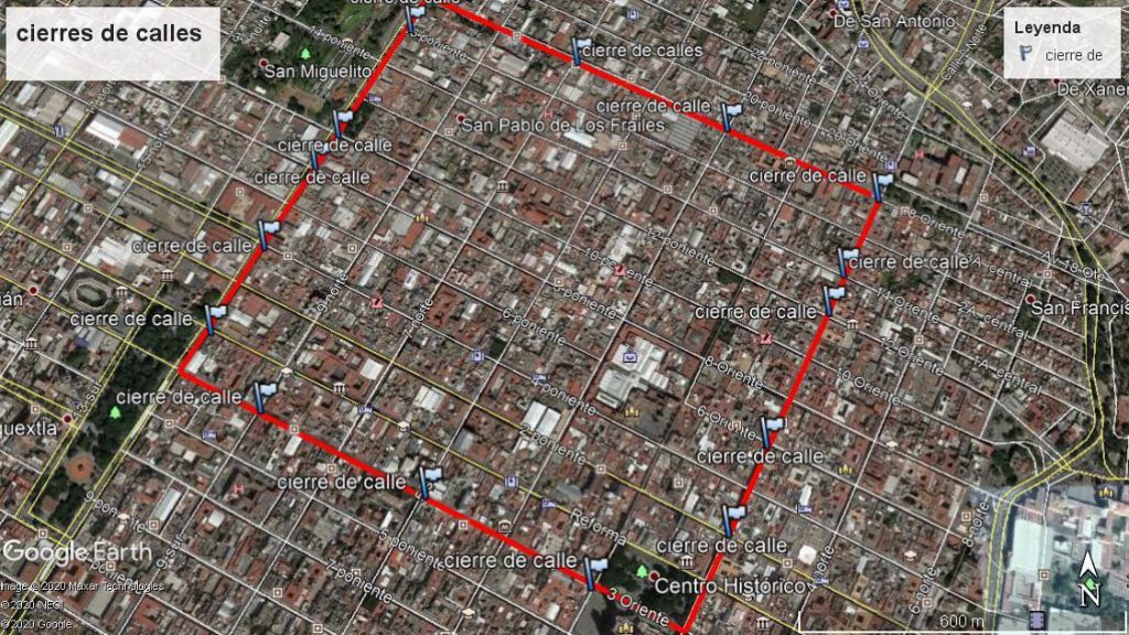 Con base al acuerdo del Gobierno Federal por el cual se establecieron las medidas preventivas a implementar para la mitigación y control de los riesgos para la salud que implica dicha enfermedad, se cerrará a partir de hoy, lunes 20 de abril del 2020, el polígono del Centro Histórico que comprende de la calle 3 oriente-poniente a la 18 oriente-poniente, y de la calle 2 norte-sur a la Avenida 11 norte-sur al flujo vehicular.