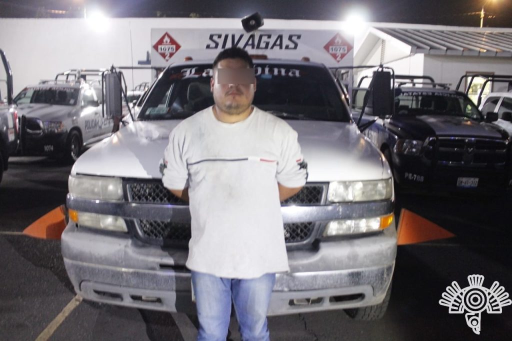 De acuerdo con el trabajo de inteligencia de la Secretaría de Seguridad Pública, el asegurado es unos de los principales distribuidores de gas LP, presuntamente robado de ductos de gas de la zona de la junta auxiliar de Santa María Xonacatepec.