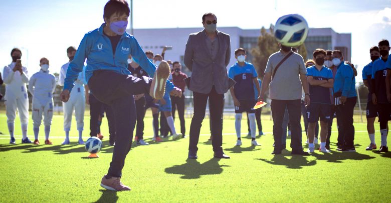 Comprometida con el deporte universitario, la Rectora Lilia Cedillo Ramírez inauguró con la tradicional patada de apertura la cancha 5 de fútbol soccer, frente a la Unidad de Seminarios en Ciudad Universitaria, luego de los trabajos de mantenimiento y rehabilitación que se hicieron a este espacio que beneficiará a mil 500 estudiantes.