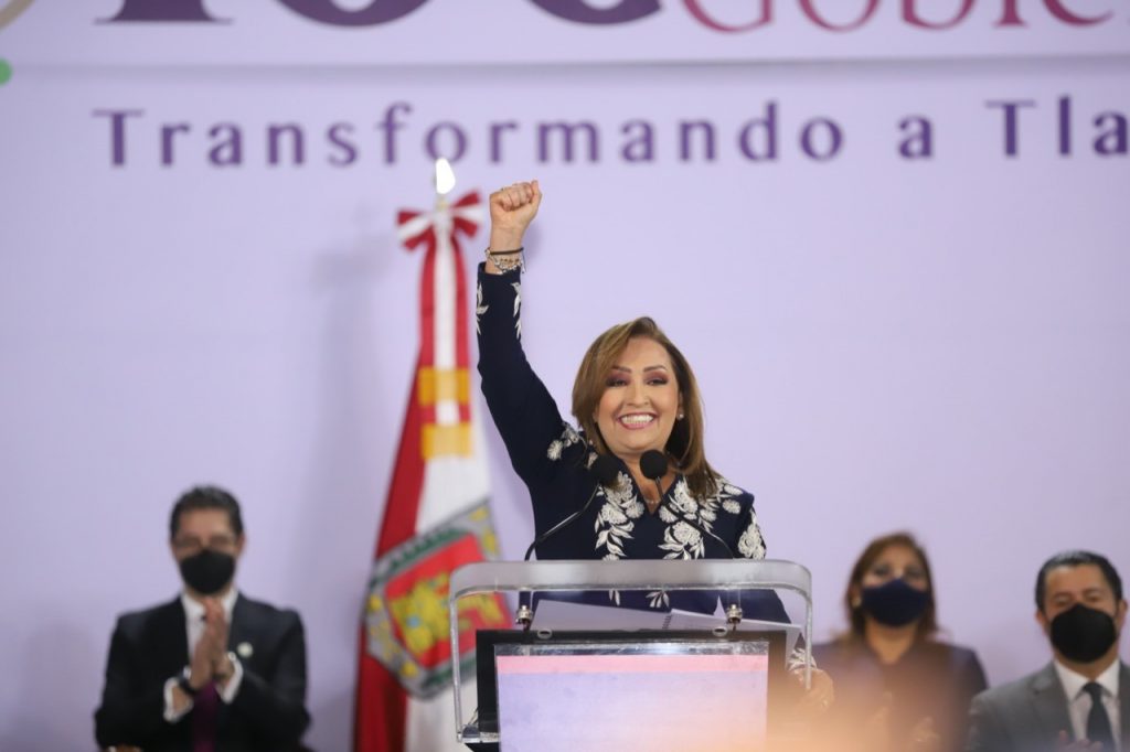 En la Plaza de la Constitución, la titular del Ejecutivo local agradeció la confianza del pueblo de Tlaxcala, con el compromiso de no fallarles y nunca rendirse, “aquí sólo manda la voz del pueblo, porque el gobierno es de todas y de todos y prevalecerá el Estado de derecho en esta Cuarta Transformación”.