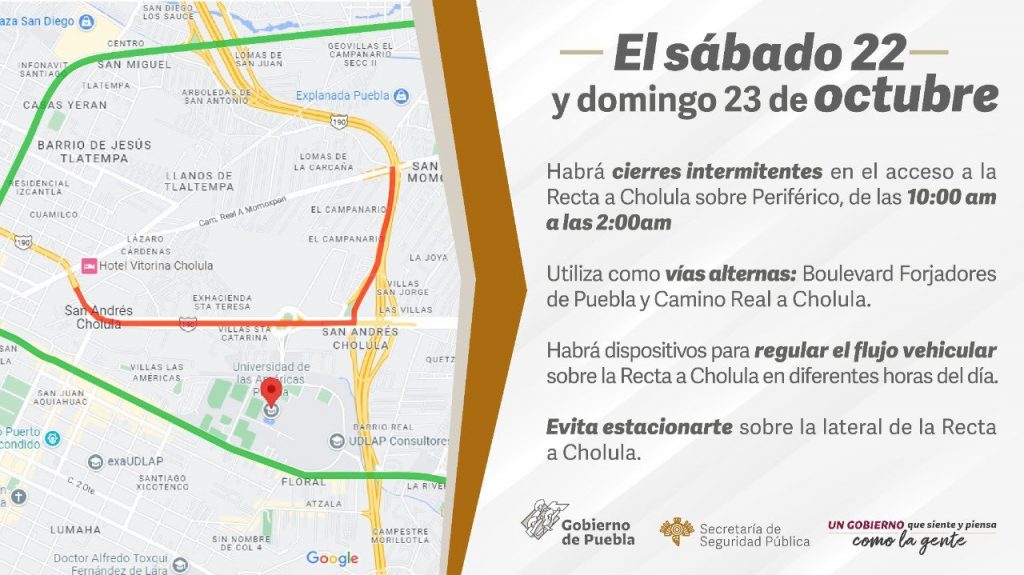 Además, durante todo el fin semana habrá dispositivos para regular el flujo vehicular sobre la Recta a Cholula y se recomienda evitar estacionarse sobre la lateral de esta vialidad.