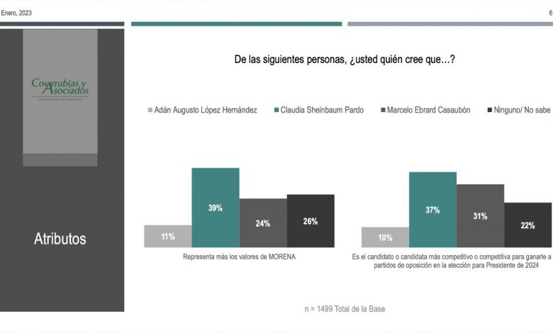 Según el informe de este mes de enero, la actual Jefa de Gobierno de la Ciudad de México se destaca frente al resto de los aspirantes de su partido en los atributos de veracidad (54%), tolerancia (60%), honradez (54%), honestidad (55%), así como en ser la aspirante más competitiva frente a la oposición (37%) y la mejor representante de los valores de su partido (39%). Lo anterior, en tanto Morena, frente al resto de la oposición, obtiene una intención de voto del 48% que lo ubican en un franco primer lugar, con 36 puntos de ventaja sobre el PAN quien apenas recibe el 12% de las preferencias.