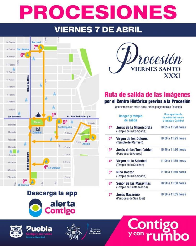 Para que las celebraciones de Semana Santa en Puebla se lleven a cabo en orden y con la mayor seguridad para las y los participantes, el Gobierno Municipal informó los cierres viales correspondientes a la XXXI Procesión de Viernes Santo que comienza a las 12:00 horas.
