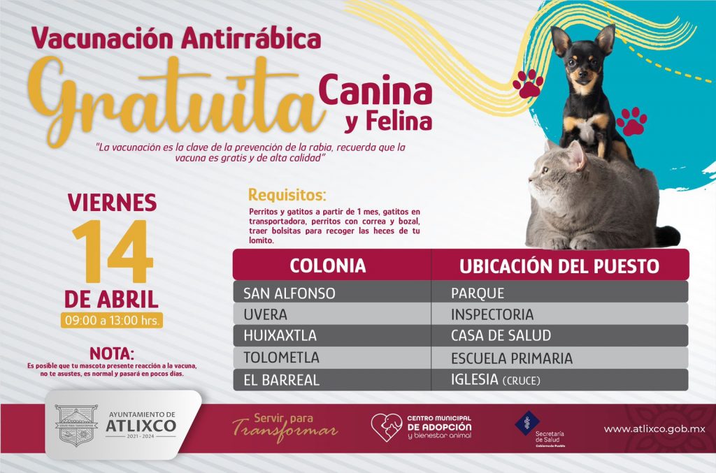 La meta es aplicar más de 17 mil dosis a perros y gatos, por lo cual, la comuna exhorta a las y los dueños responsables acudir con su mascota a los módulos itinerantes, es importantes estar pendientes de los calendarios de vacunación en las páginas oficiales del Ayuntamiento de Atlixco o DIF Municipal ya que, a la par de esta actividad, también se aplican vacunaciones en los Martes de Atención Ciudadana, así como Jornadas DIF-Bienestar.