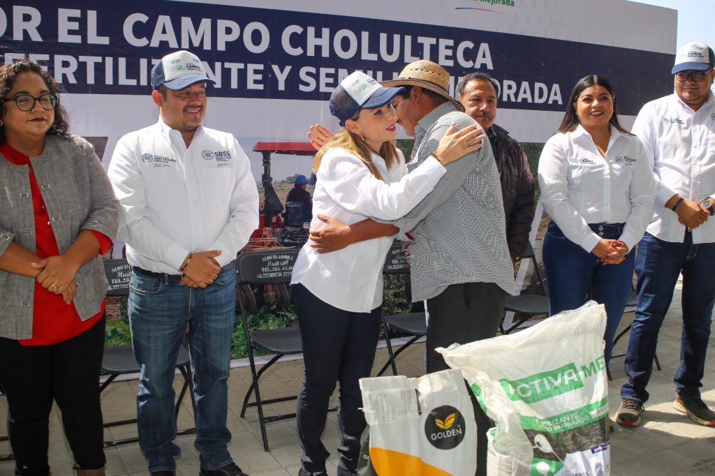 San Pedro Cholula, Puebla.- En beneficio de más de 400 productores de 11 juntas auxiliares y la cabecera de San Pedro Cholula, la Presidenta Municipal, Paola Angon encabezó en Parque Soria este lunes la entrega de 74 toneladas de fertilizantes y semilla mejorada para maíz, hortalizas, legumbres y flores.