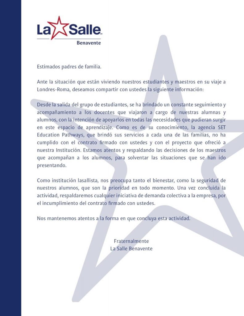 Em ese sentido, La Salle Benavente dijo estar atenta a la seguridad de sus alumnos, “que son prioridad en todo momento”. En ese punto, se resalta que una vez concluida la actividad, “respaldaremos cualquier iniciativa de demanda colectiva a la empresa, por el incumplimiento del contrato firmado con ustedes”.