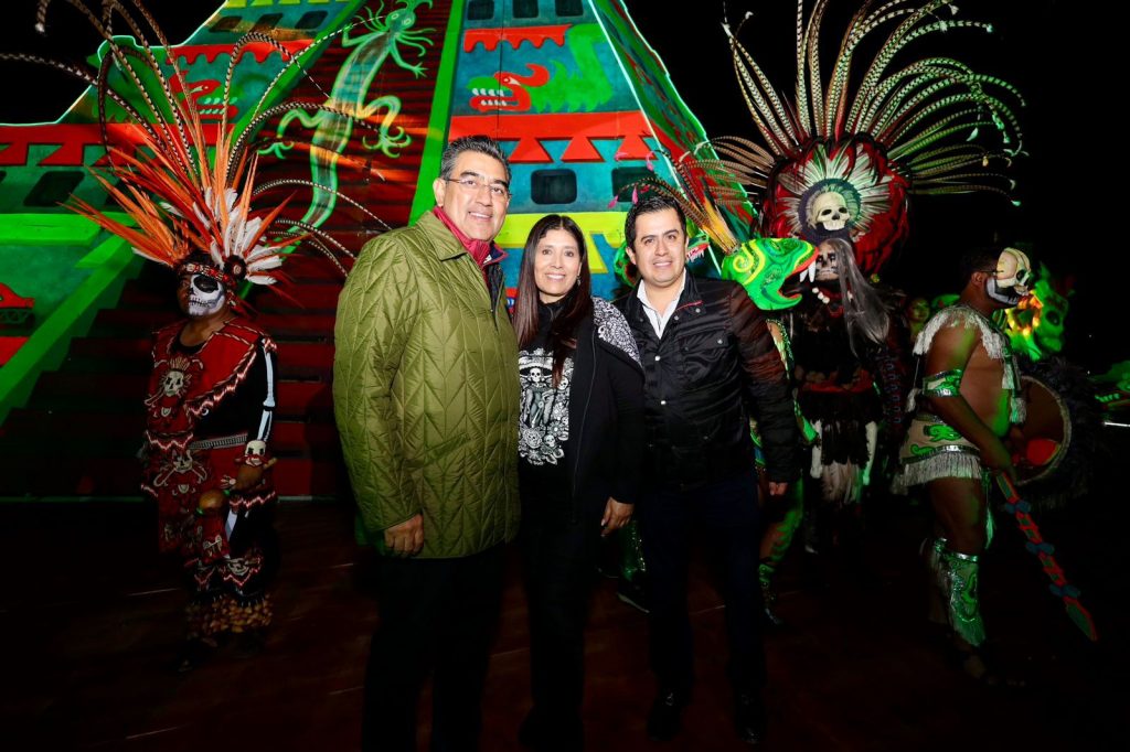 Sergio Salomón inauguró la luminaria de temporada que adorna las principales calles de este pueblo mágico, para después participar en la caminata de velas y antorchas, recorriendo la Calzada de las Almas, la cual fue adornada con grandes y coloridos tapetes de aserrín que representan los nueve pasos al Mictlan y son la ruta que dirige a la laguna.
