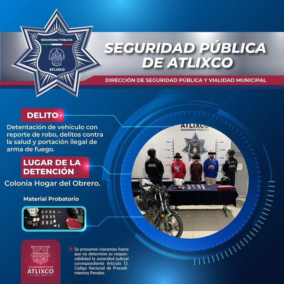 Por otra parte, mediante los recorridos de seguridad y vigilancia, integrantes de la SSP Atlixco, ubicaron en la colonia Cabrera a un varón que viajaba a bordo de una motocicleta, misma que había sido robada afuera de un domicilio, el agraviado señaló al probable responsable por lo que fue puesto a disposición ante el ministerio público. En el mismo sentido, un sujeto más fue puesto ante el agente del MP por la probable responsabilidad de robo a comercio, detenido en la colonia Hogar del Obrero.