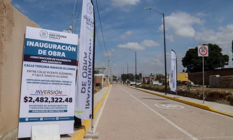 San Pedro Cholula, Puebla.- La Presidenta municipal Paola Angon, entregó a vecinos de San Cristóbal Tepontla, la pavimentación con adocreto de 1,450 metros cuadrados de la calle Tercera de Ignacio Allende, que incluyó pintura, banquetas guarniciones, señalética, topes y luminarias, con lo que continúa ejecutando obras integrales para fortalecer la infraestructura del municipio en favor de una mejor movilidad para las familias cholultecas de esta junta auxiliar.