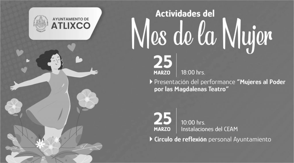 Para conocer detalles de esta amplia cartelera, visita las redes sociales del Ayuntamiento de Atlixco o llama directamente al Centro Especializado para la Atención de la Mujer al 244-446-5658.