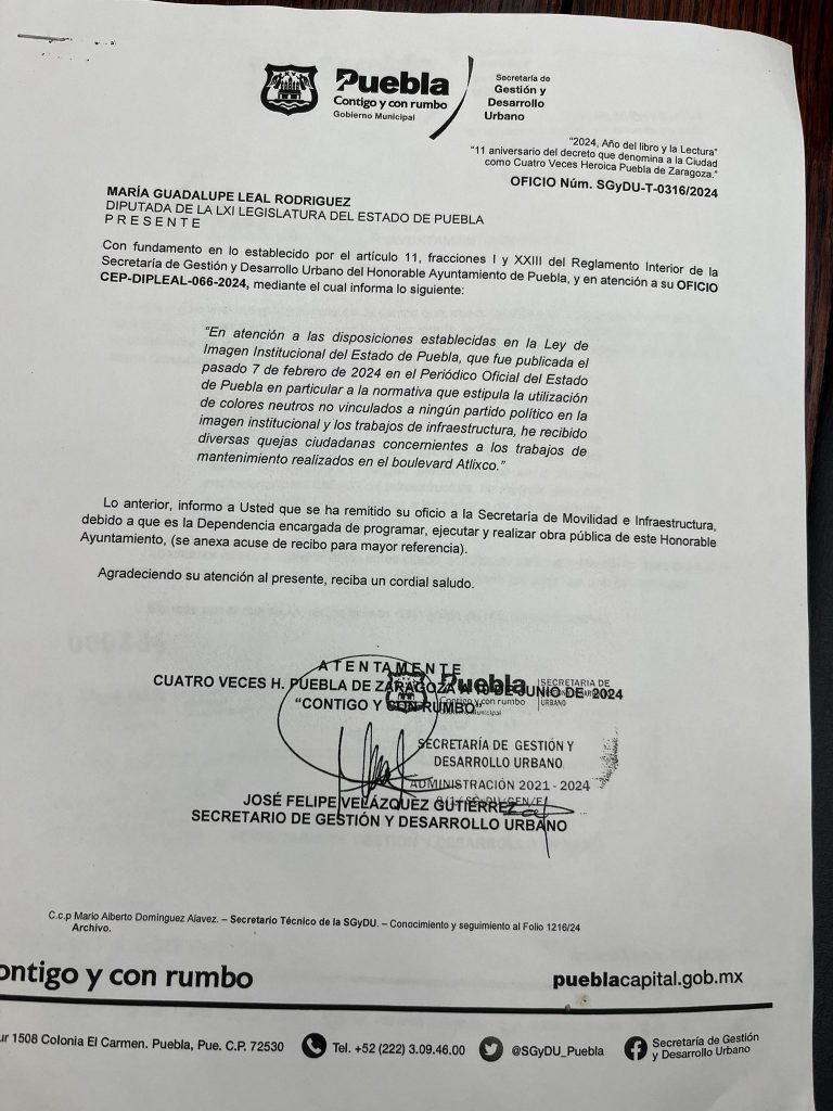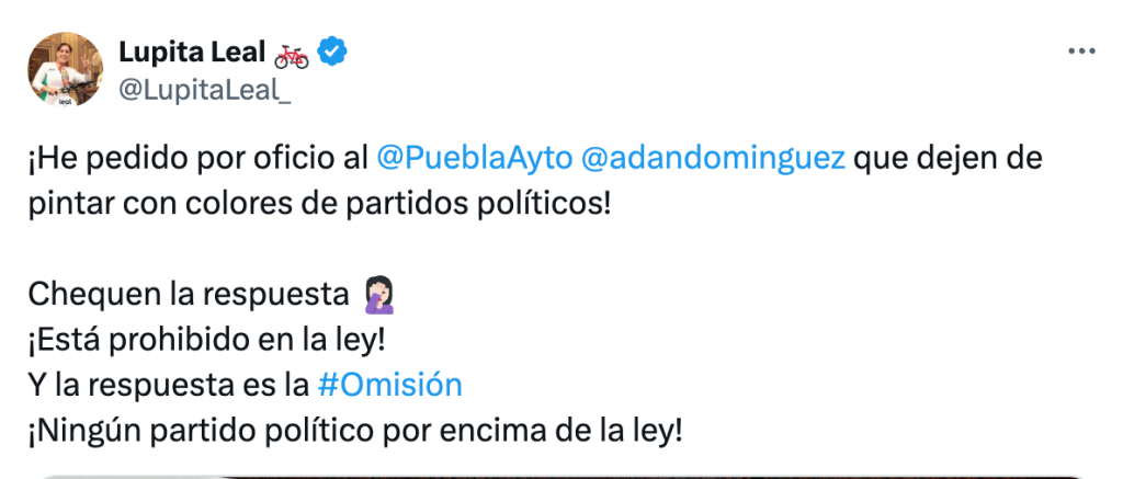La diputada Guadalupe Leal (PAN) pidió, mediante oficio, que el Ayuntamiento de Puebla deje de pintar obras con colores partidistas, sin importar que la administración municipal está a cargo del partido del que ella emanó. La legisladora expuso en redes sociales la respuesta que obtuvo.