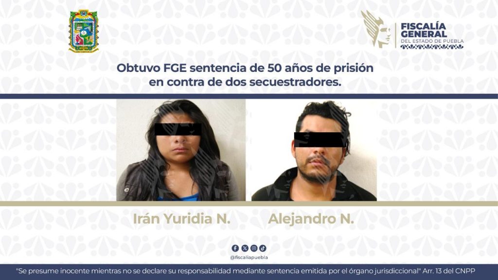 La Fiscalía General del Estado de Puebla logró una sentencia de 50 años de prisión para Alejandro N. y Yuridia N., tras comprobarse su participación en un secuestro agravado ocurrido en Tlachichuca en mayo de 2017.