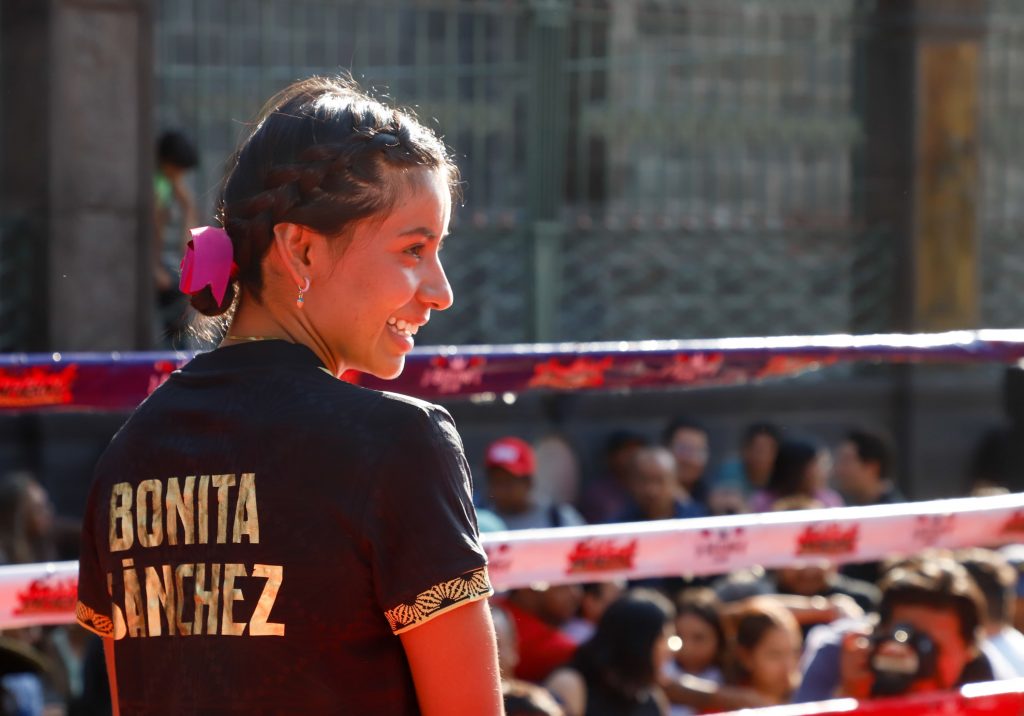 Durante la práctica, niñas, niños y mujeres presenciaron las habilidades de la boxeadora, quien ejecutó diversas rutinas en el ring. Además, otros peleadores realizaron sparring como parte de su preparación para las peleas del viernes.
