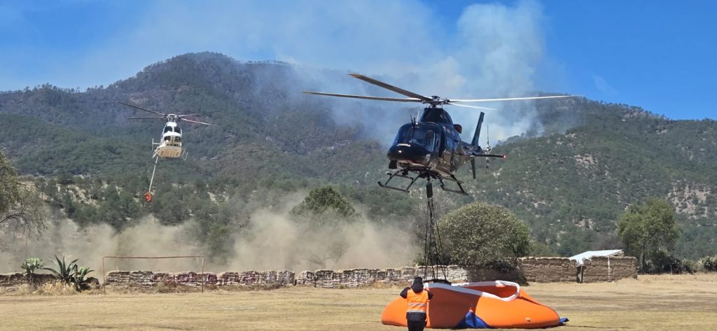 Durante la jornada del miércoles, la operación fue reforzada con el apoyo aéreo de dos helicópteros, los cuales realizaron múltiples vuelos para arrojar más de 54 mil litros de agua sobre las áreas afectadas en el incendio de Libres.