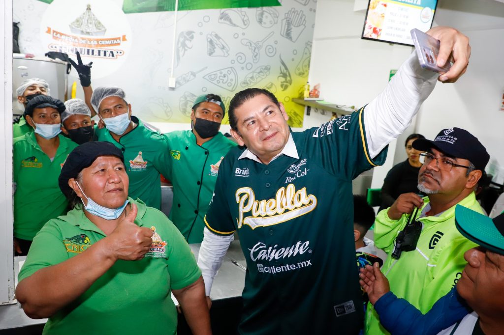 Armenta, acompañado por líderes migrantes poblanos, como Ricardo Andrade Cerezo y Carlos Orea Alonso, compartió momentos con los asistentes y les regaló gorras del equipo local.