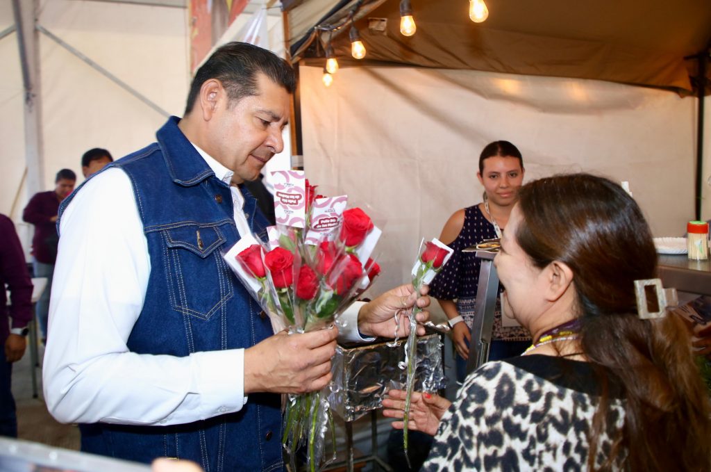 Durante un recorrido, el gobernador Alejandro Armenta obsequió rosas a las mamás que se dieron cita en el recinto.