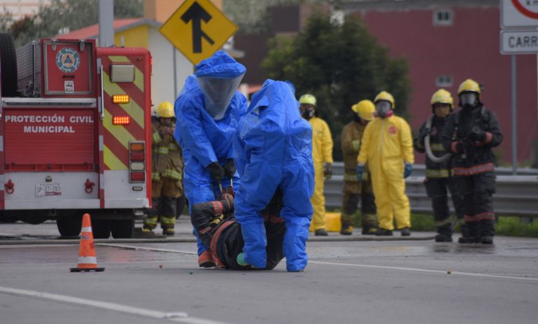 El ejercicio, realizado en la lateral del Periférico Ecológico y el Bulevar Forjadores, simuló una fuga de amoniaco proveniente de una pipa accidentada.