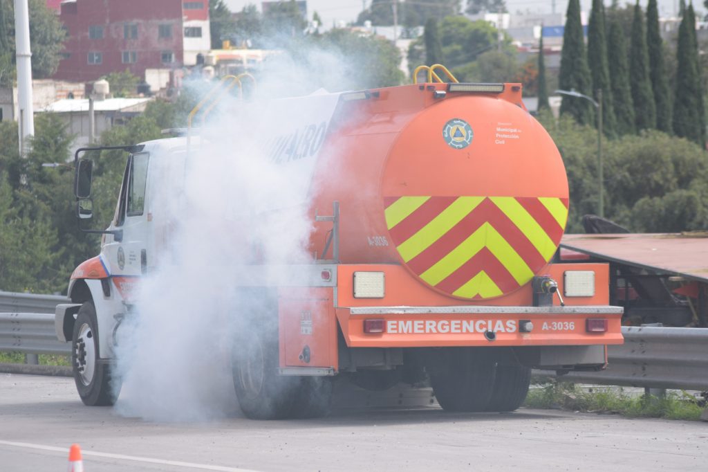 El ejercicio, realizado en la lateral del Periférico Ecológico y el Bulevar Forjadores, simuló una fuga de amoniaco proveniente de una pipa accidentada.