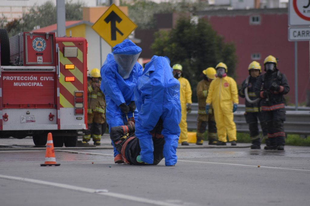 Durante el ejercicio, se identificó el agente químico, se evaluó la seguridad del personal y se realizaron acciones como el rescate de un lesionado, su descontaminación y traslado al hospital, siguiendo protocolos estrictos.