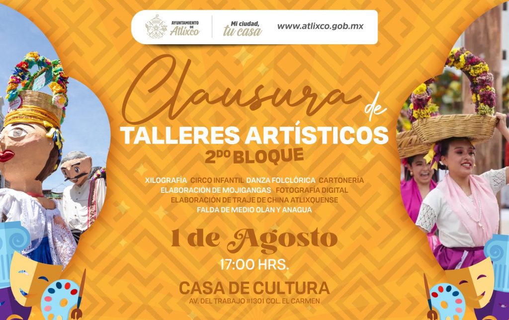 Este viernes 1.º de agosto, a las 17:00 hrs, se llevará a cabo la clausura del segundo bloque de talleres artísticos en la Casa de Cultura Acapetlahuacan, un evento que promete ser una verdadera celebración del talento atlixquense.