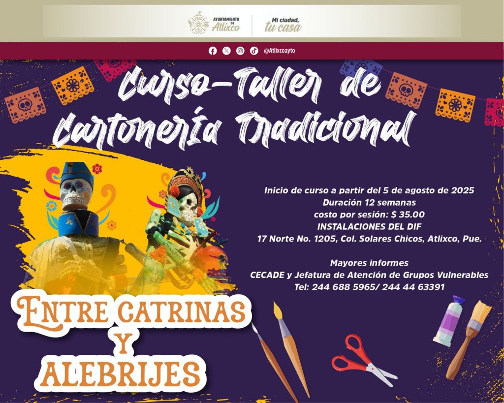 Con el compromiso de preservar las tradiciones y fortalecer las expresiones artísticas del municipio, la presidenta municipal de Atlixco, Ariadna Ayala, hace una cordial invitación a niñas, niños, jóvenes y adultos a participar en el curso-taller “Entre Catrinas y Alebrijes”, que busca rescatar y promover el arte de la cartonería.