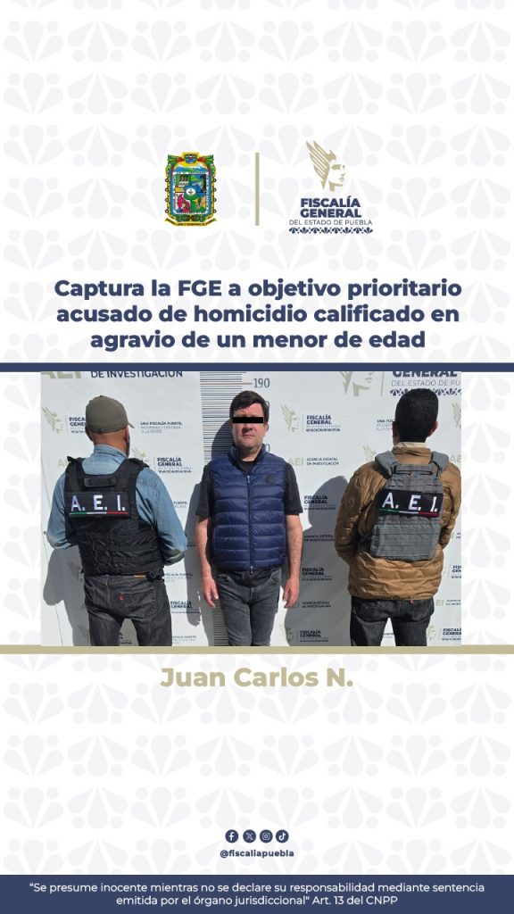 La Fiscalía General del Estado informa la detención de Juan Carlos N., de 43 años de edad, identificado como objetivo prioritario, por su presunta participación en una agresión con arma de fuego contra los ocupantes de un vehículo, hecho en el que perdiera la vida un menor de edad y resultara lesionado un adulto.