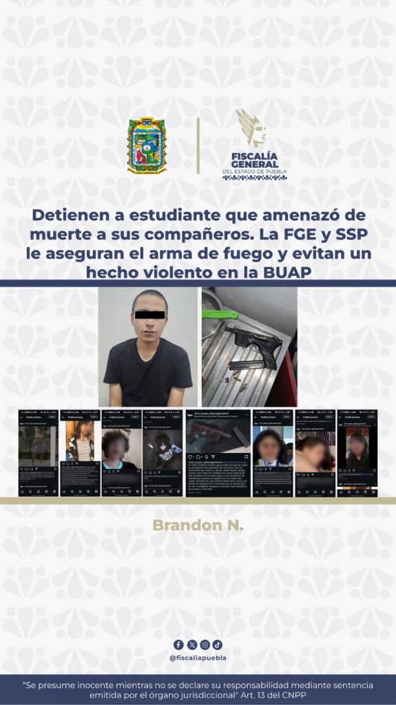 La Fiscalía General del Estado de Puebla confirmó la detención de un joven relacionado con amenazas dirigidas a estudiantes y docentes de la Benemérita Universidad Autónoma de Puebla (BUAP).