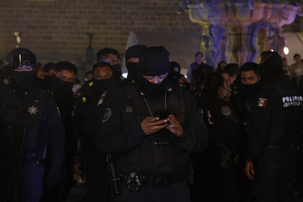 1 Marzo 2025.- Policías municipales se manifiestaron con sirenas encendidas en el zócalo de Puebla, para exigir justicia por los dos policías asesinados durante la madrugada en la colonia Del Valle. //Mireya Novo/Agencia Enfoque//