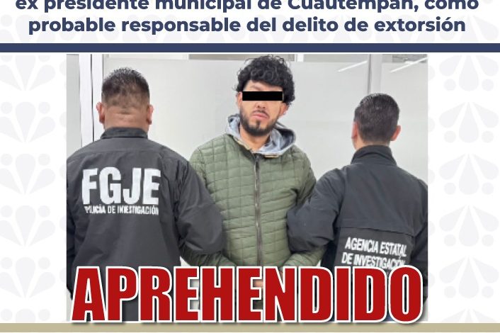 La Fiscalía General del Estado de Puebla, en colaboración con autoridades de Tlaxcala, detuvo a Gerardo N., ex presidente municipal de Cuautempan, acusado de extorsión agravada.