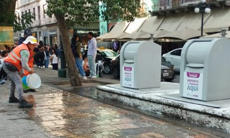 El Organismo Operador del Servicio de Limpia (OOSL) realizó una jornada de mantenimiento y desinfección en el mobiliario urbano del Centro Histórico, enfocándose en el lavado profundo de papeleros y contenedores soterrados de la zona.