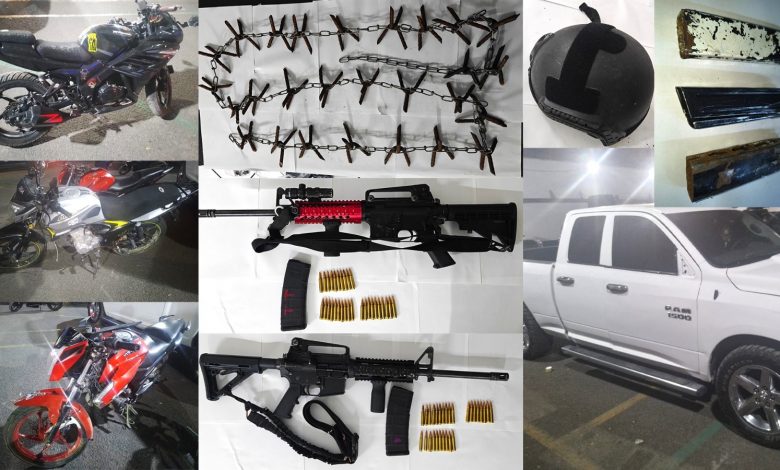 Entre los indicios asegurados en Tecamachalco, destacan más de 360 cartuchos útiles de diversos calibres, seis armas largas, entre ellas una ametralladora, siete cargadores, un casco balístico, equipo táctico, dispositivos de obstrucción vehicular, tres motocicletas y una camioneta.